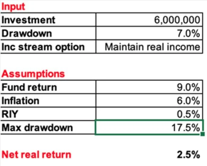 As a point of discussion and to try and get my point across, I generally comment that one needs to achieve double the returns of the percentage that you draw income against your investment if you want the capital to be sustainable for 35 years and income to keep track with 6% inflation per year. In other words: