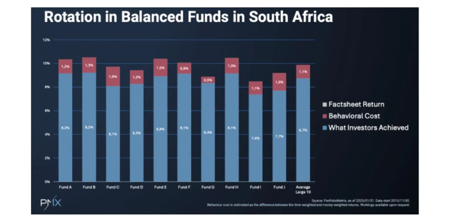 The diagram below illustrates the outcomes of 10 well-known balanced funds, which were analysed to determine the relationship between the funds’ returns over an extended period and the earnings of their investors in the same funds during the same investment period. The trend to switch to cash when markets become volatile and switch back when it is “safe” to do so again, resulted in an underperformance on average of 1,1% per year over 15 years. Simple math without compounding shows that over 10 years, this trend leads to 11% less capital for direct investors than fund returns, and 22% less over 20 years. The gap in global funds is even larger, and many retirees have an investment horizon of more than 20 years.