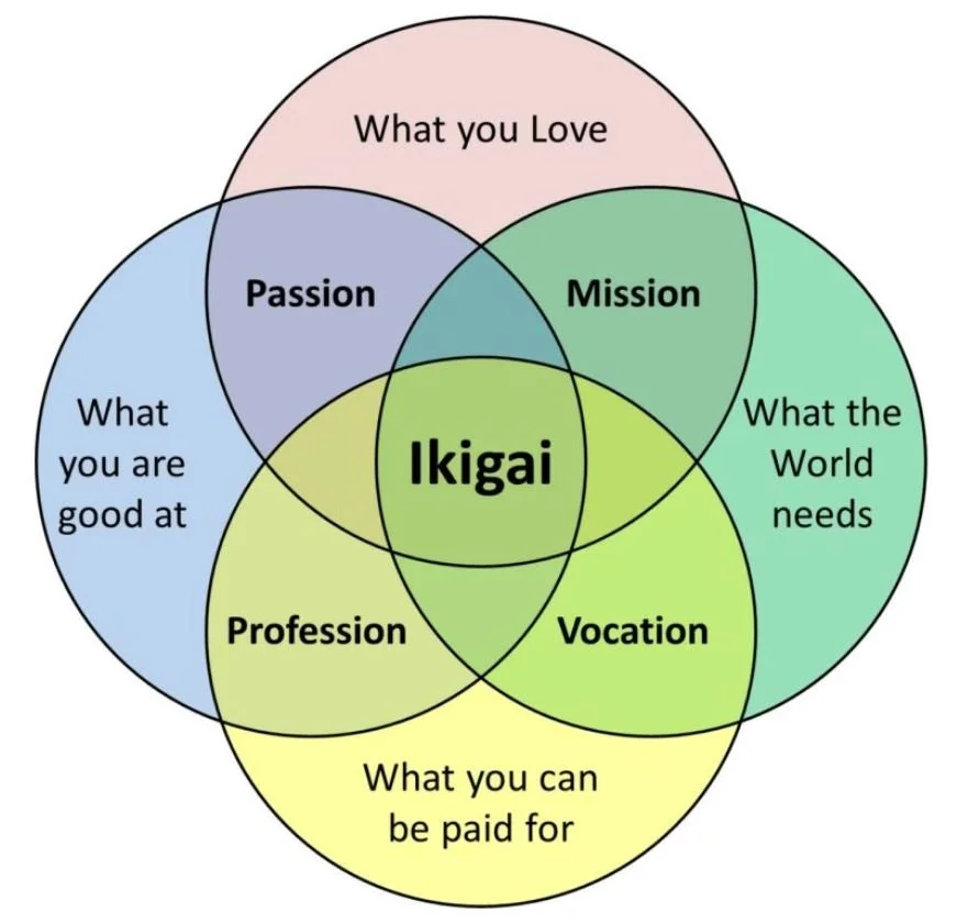 The Okinawans of Japan refer to ikigai, which means “a reason for life” – a motivation for their daily energy and vitality. Ikigai can be visualised as shown below, where four circles overlap.